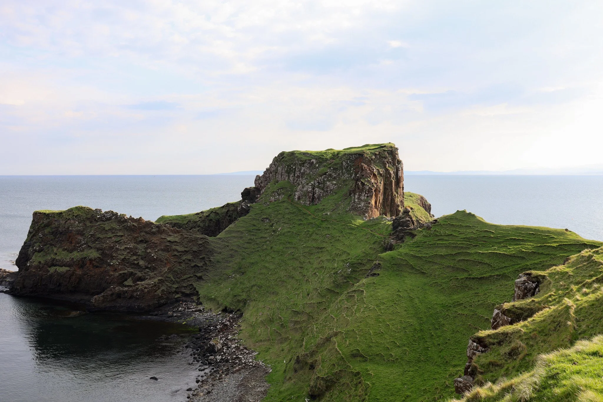 A narrow headland pushes out into the sea like a dragon’s spine, edged by cliffs and laced with informal paths. From the clifftop, the views stretch across the Sound of Raasay, with the basalt coastline falling away sharply below.
