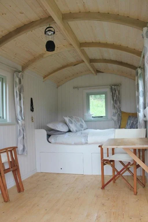 Inside, expect heaps of cosiness with a raised double bed, piles of cushions, and a wood burning stove on a slate hearth.